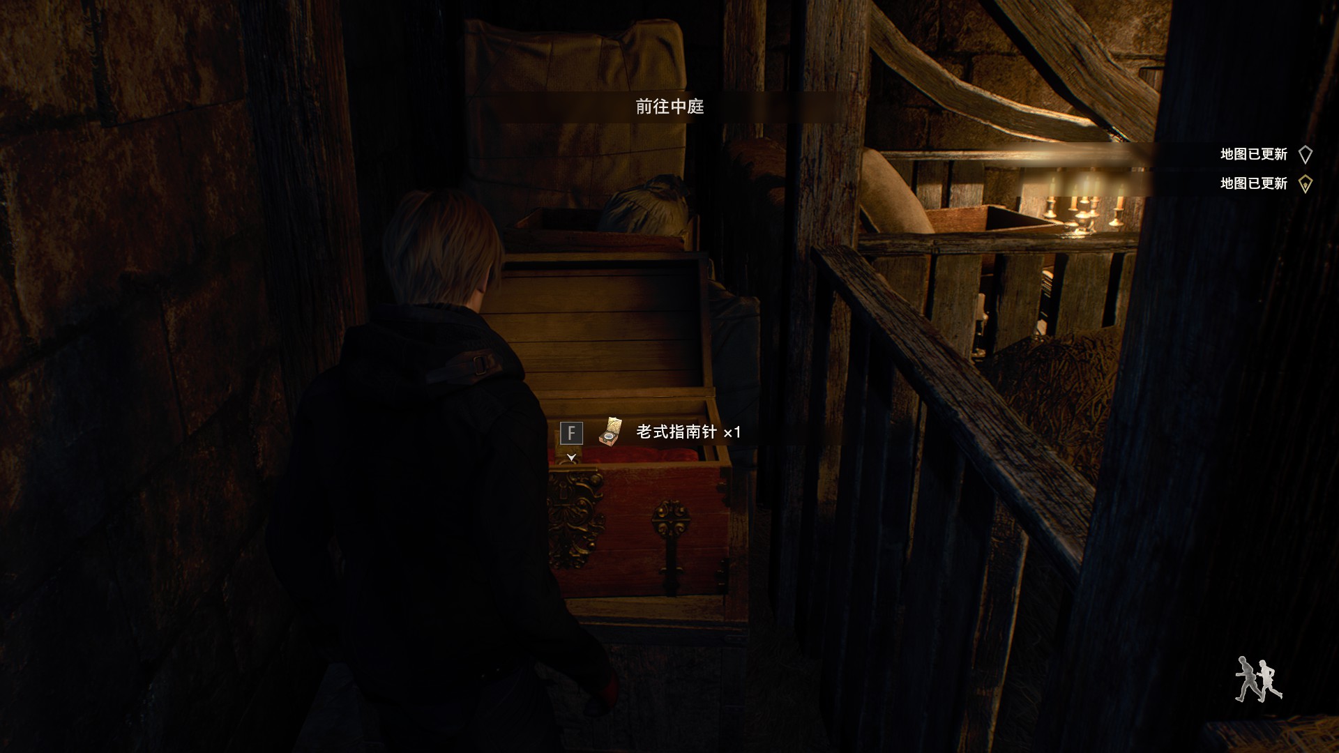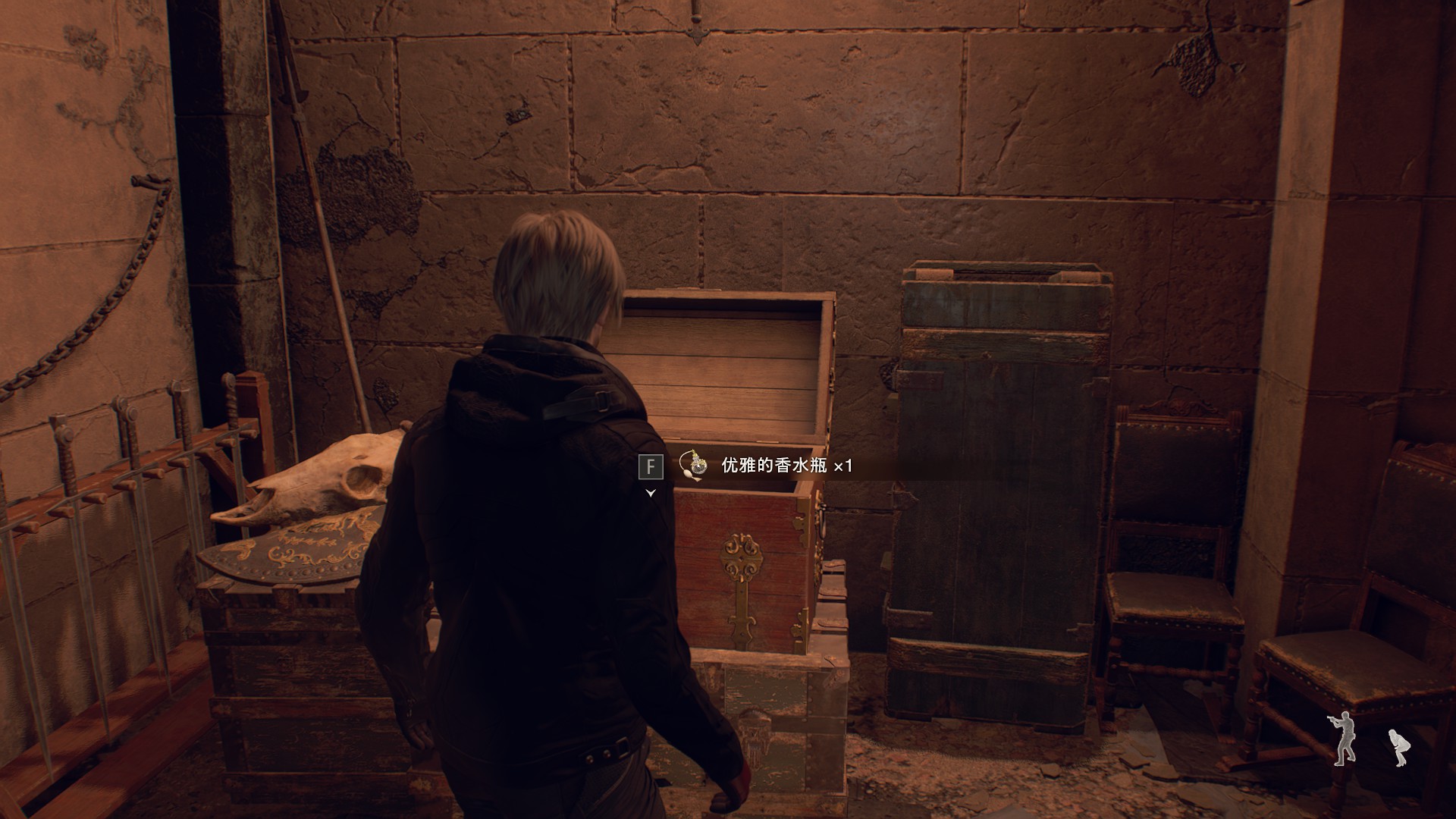 完成四把剑的解谜后来到觐见厅上层通过第二个吊灯跳过去,再从洞口跳下到达箱子处
