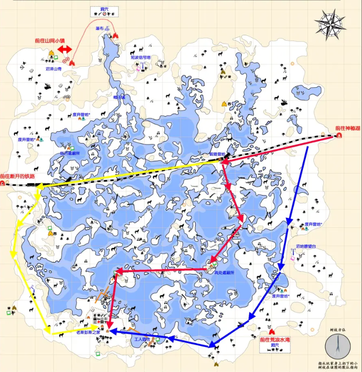 推荐锻造路线如图所示,红色是路程最短且遇狼概率最低的路线,除了偷猎营地和老斯彭斯之外几乎不会碰到狼,但是需要穿越沼泽中心,在视野不好的时候容易迷路。蓝色路线较为稳妥,全程贴边不存在迷路问题,途径一个恒温山洞一个加温山洞也不怕掉温,缺点就是路程远,路过的狼点多。黄色路线是最远的路线,不推荐从神秘湖出发走这条路,迷路的时候可以用,大多用于从沼泽山脊出发锻造。