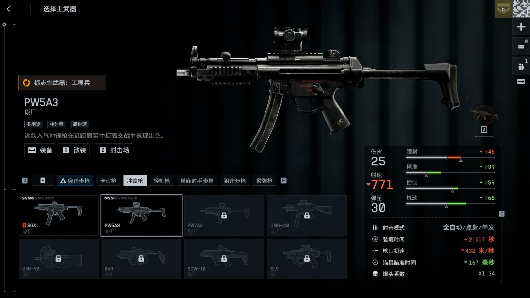伤害: 25 | 射速: 30 | 弹匣: 30 | 腰射: 46 | 精准: 034 | 控制: 57 | 机动: 68 | 射击模式: 全自动/单发 | 装填时间: 2.517秒 | 枪口初速: 402米/秒 | 瞄具瞄准时间: 167毫秒 | 爆头系数: X1.34
