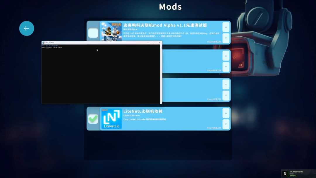 从下往上依次激活mods,两个前置mods,一个控制台mod,和联机mod。