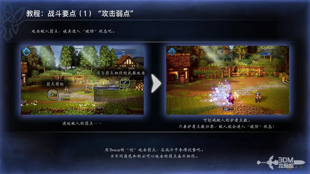 攻击敌人的弱点,将敌人名字旁边的盾牌点数清零,敌人就会进入“破防”状态。