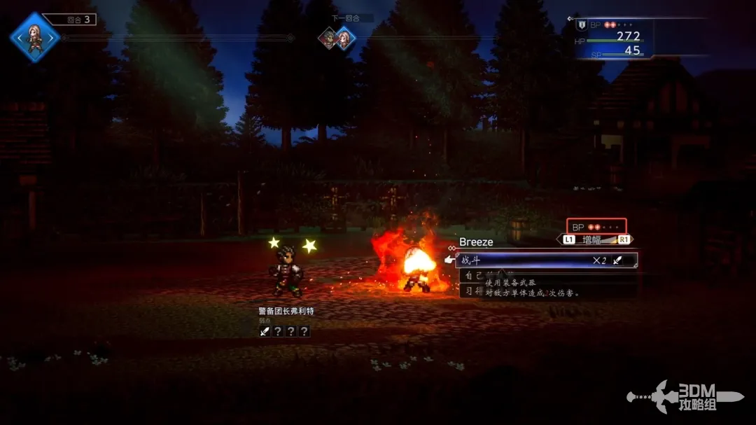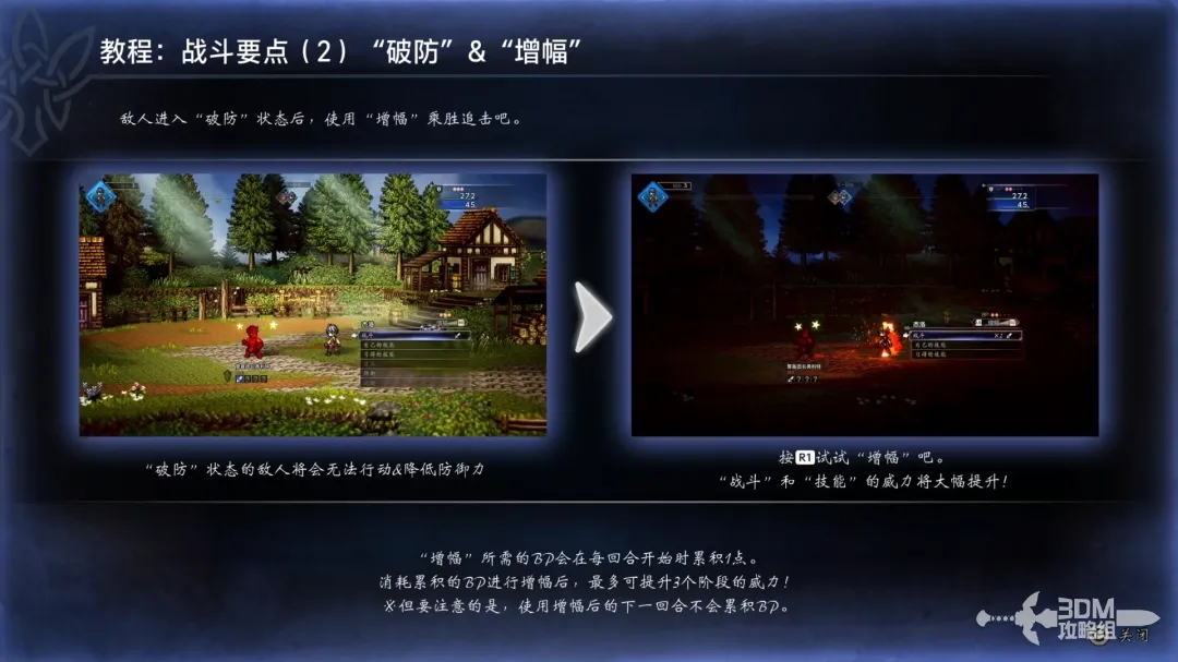 敌人进入破防状态后将无法行动,还会降低防御力;每回合开始都会积攒BP点数,按R1消耗BP点数增强攻击和技能的伤害。