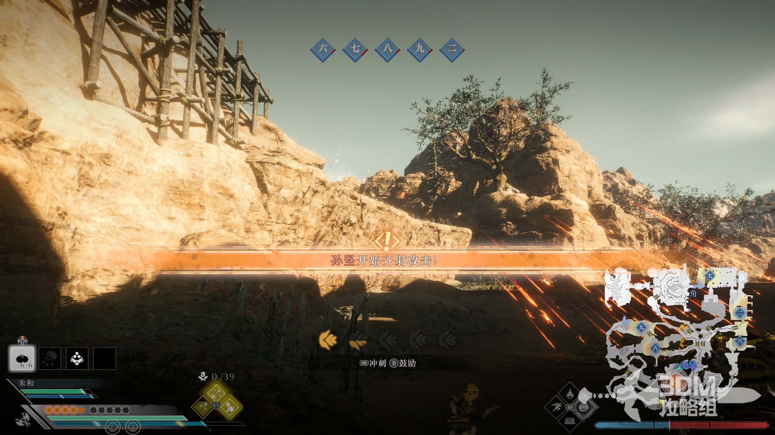 击败这里的敌军后继续前进,张角会遭受到孙坚的箭雨攻击,我们需要绕到上方去击败孙坚才可以解除箭雨。
