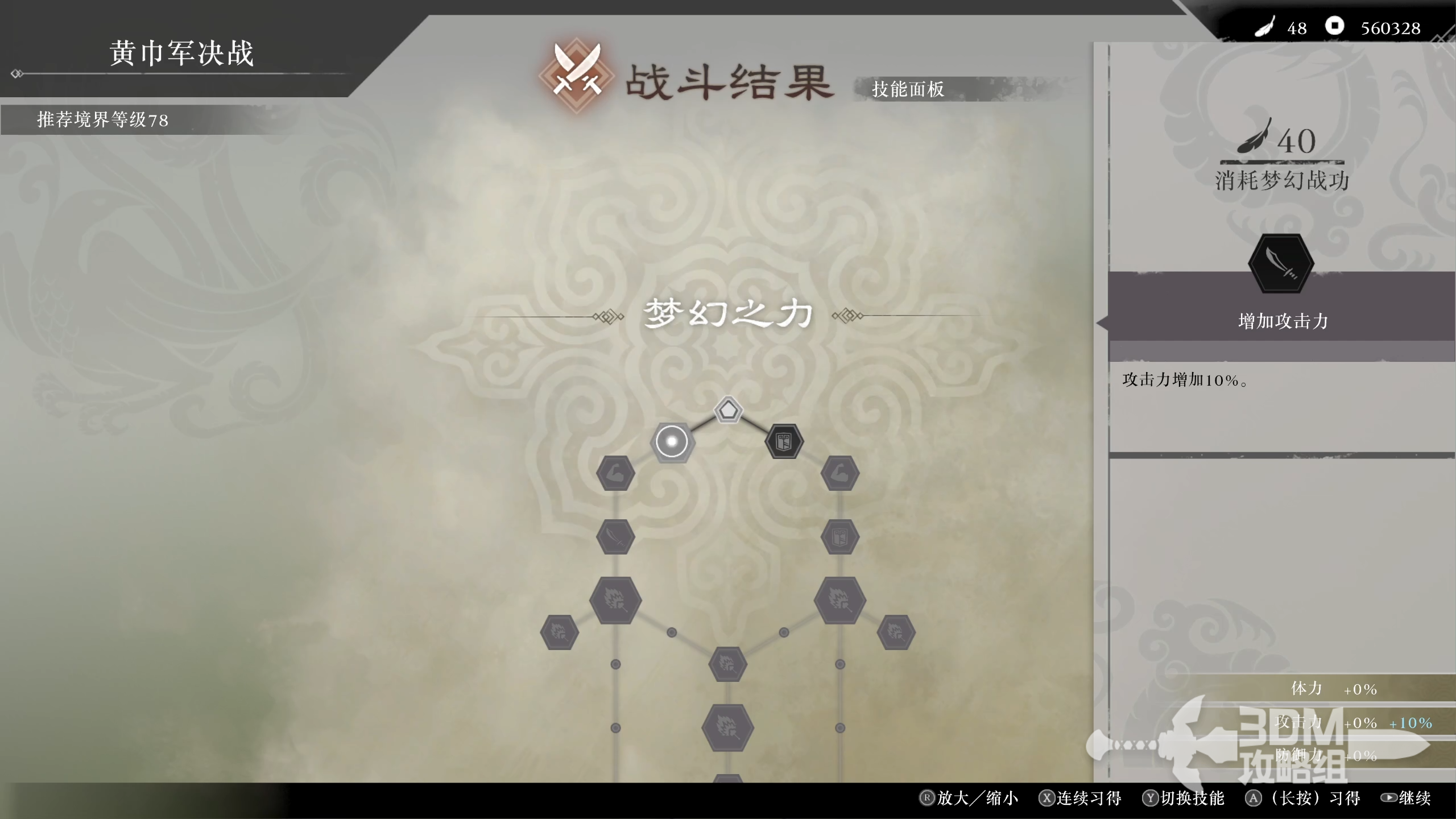 战斗结束后,我们可以看到有梦幻战功的技能树,可以通过在DLC完成任务和战斗结束结算战功,来解锁梦幻之力。