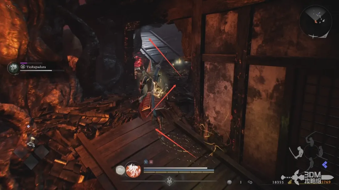 清理完房间的敌人后,穿过房屋,往右走,绕屋子半圈再沿着废墟上到房顶,接着顺着骨头往前走。
