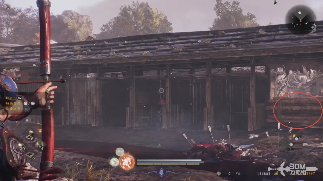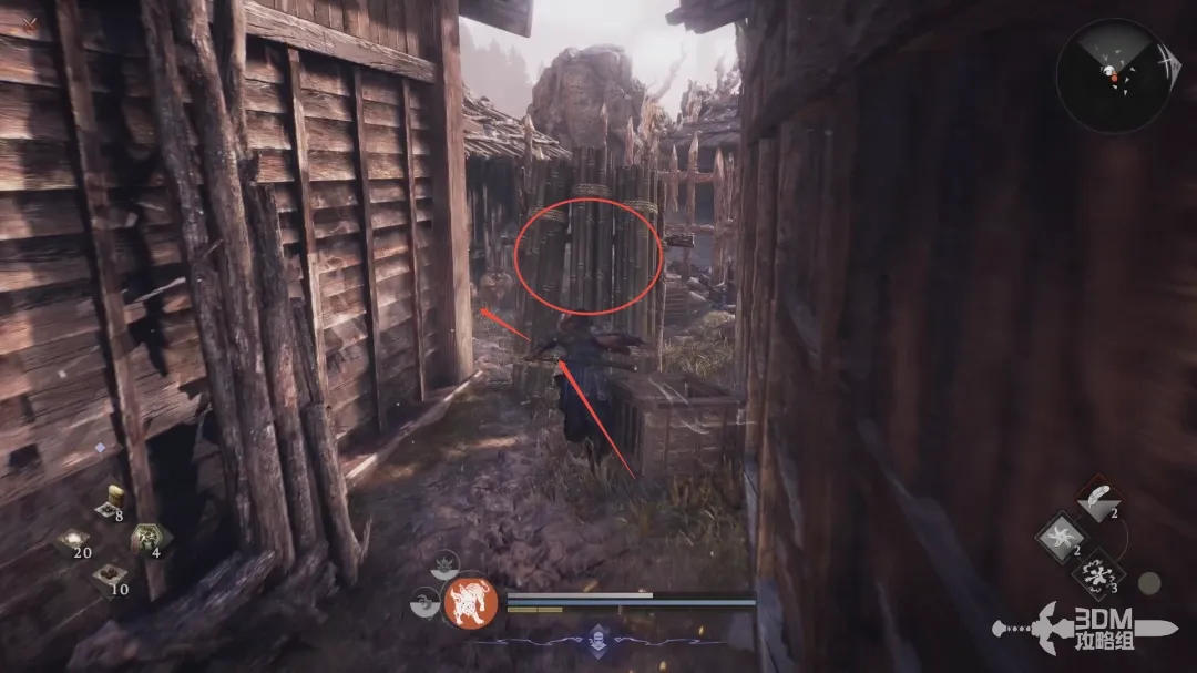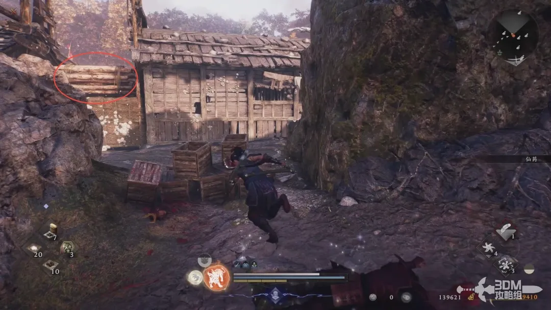 再从右边的梯子爬上去,右边有一捆木头,互动踢下去开启一个捷径。