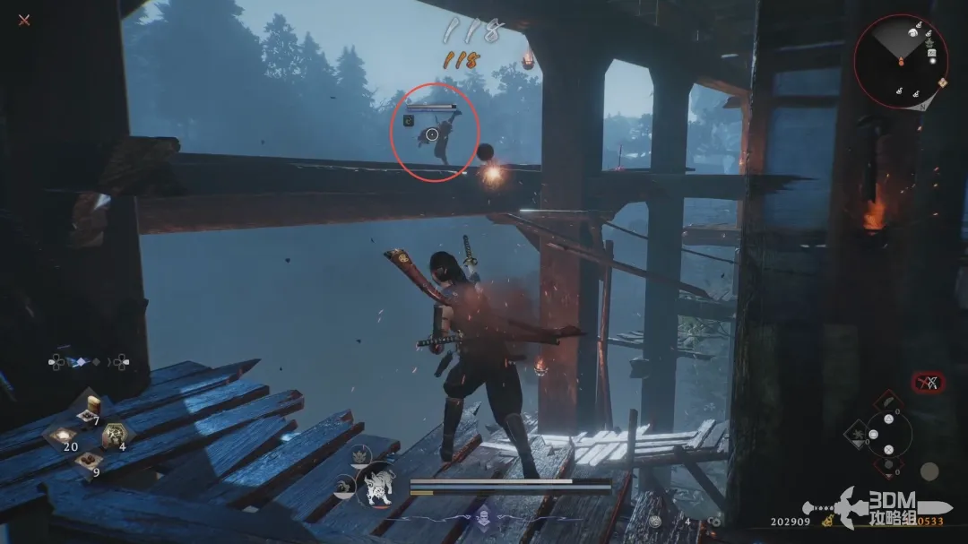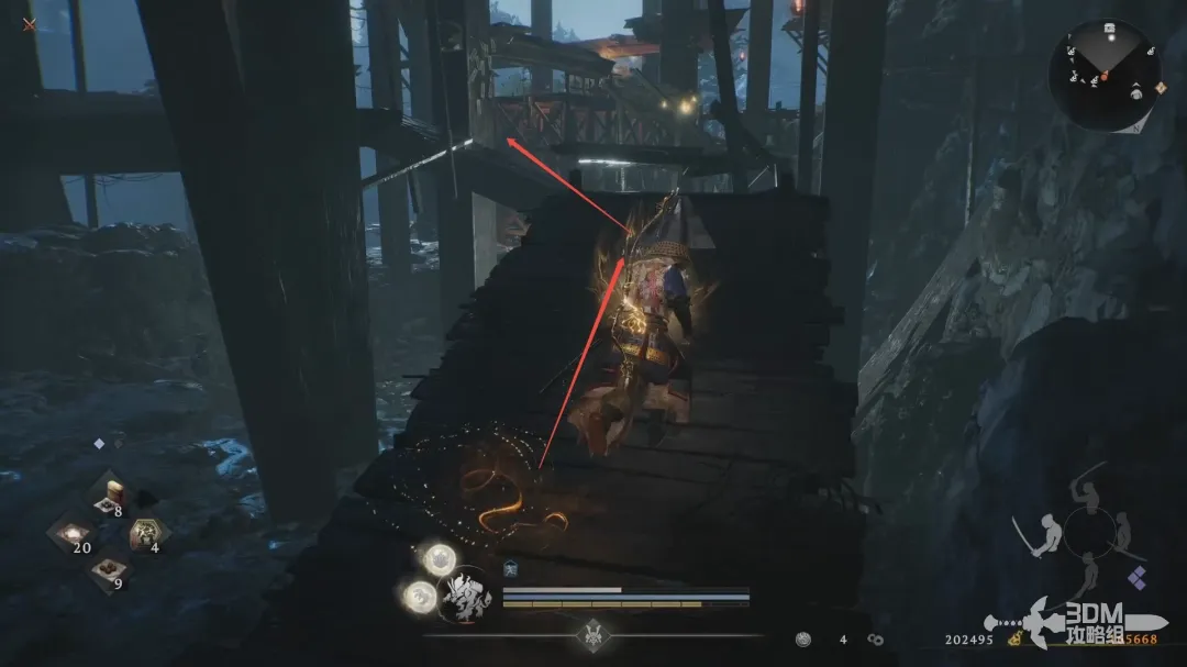 清理掉下面的敌人,从这边的木板往前走,然后沿着大梁走。