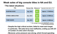 《古墓丽影9》在四周内卖了340万,发行商SE近日表示,这款游戏没能达到预期的销售目标。SE的另一款大作《杀手5:赦免》自去年11月发售之后卖了360万份,而《热血无赖》则于去年8月发售之后卖了175万。SE在去年9月预计在北美和欧洲零售游戏店,6个月能卖出1千4百90万份游戏。《古墓丽影9》,《杀手5:赦免》和《热血无赖》都是大作,在全球总共卖出了875万份,但很明显SE的目标定的有些过大。据SE最新的财报显示,他们没有计算数字版的销量。预测中的数字是本财年的,5天之后,他们很可能更换这一数字。SE游戏在北美游戏销量势头有些疲软。北美只卖到了欧洲的三分之二。在去年9月份时,SE预测北美的销量将会高于欧洲。SE必须在疲软的主机市场上采取有效措施了,近日工作总裁Yoichi Wada也被替换了。