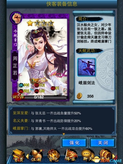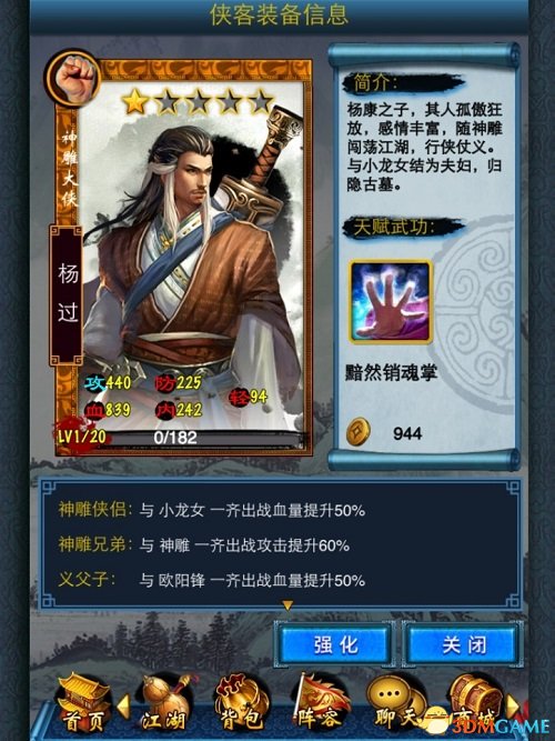 “一见杨过误终身”,金庸群侠中人气最高的大侠非“情侠”杨过莫属,清雅俊秀的杨过不知道让书里书外多少妹子对他钟情不已,但他一心只愿与小龙女相守古墓,这份至情至性的真爱让人又赞又叹。《东邪西毒》手游中杨过为橙色豪侠,天赋武功“黯然销魂掌”,侠客缘为与小龙女血量提升50%的“球探足球比分”、与神雕攻击提升60%的“神雕兄弟”,与欧阳锋血量提升50%的“义父子”。豪侠杨过身负玄铁重剑,面貌英俊,略带沧桑,“神雕大侠”迷人风采展露无余。