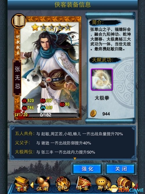 习九阳神功、学乾坤大挪移、悟太极真义、参圣火令绝学……金庸先生自己都说过,他笔下武功最为高强的主角极有可能是张无忌,因为他集各家所长,身怀数种绝学。与他的绝世武功同样出名的还有他那一段剪不断理还乱的“情史”,明教教主张无忌可以说是一个血肉丰满极具特色的大侠。在《东邪西毒》中张无忌以一袭白衣的翩翩公子形象登场,天赋武功“太极拳”威力强大,侠客缘更是极其用心,与原著内容十分贴合,特别是“五人同舟”让人会心一笑。