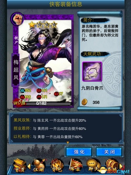 很多人都不记得女魔头梅超风曾经有个很美的名字“梅若华“,那时的她是人如其名般美丽的女子,会倚在桃花树下对着心爱的大师兄低头浅笑。后来的后来,梅若华消失了,江湖中只剩一个心狠手辣的女魔头梅超风,她的往事再没人记得。《东邪西毒》中的梅超风双目失明,神态狂傲之余微有凄凉之色,天赋武功为“九阴白骨掌”,最前面的两个侠客缘跟她这一生最重要的两个人有关,一个是她毕生挚爱的大师兄陈玄风,另一个则是她的授业恩师黄药师。