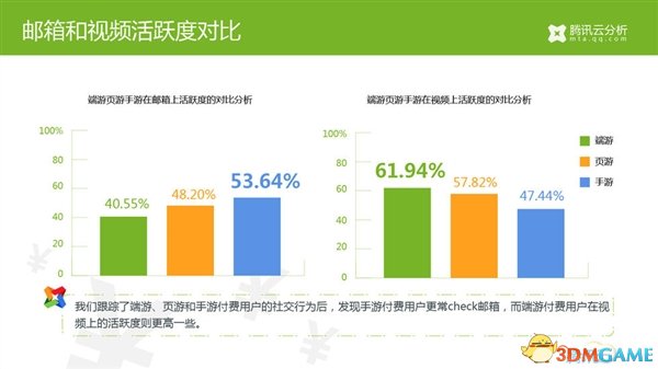 - 在跟踪了端游、页游和手游付费用户的社交行为后,发现手游付费用户更常check邮箱,而端游付费用户在视频上的活跃度则更高一些。