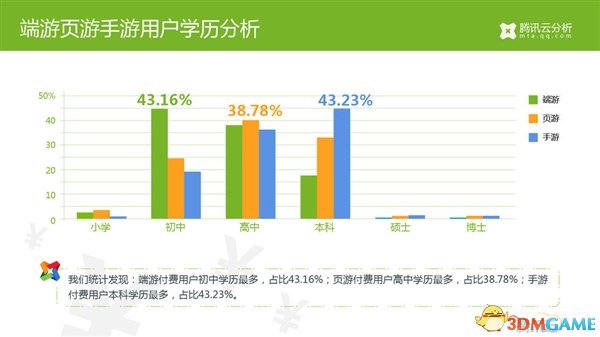 - 端游付费用户初中学历最多,占比43.16%; 页游付费用户高中学历最多,占比38.78%; 手游付费用户本科学历最多,占比43.23%。