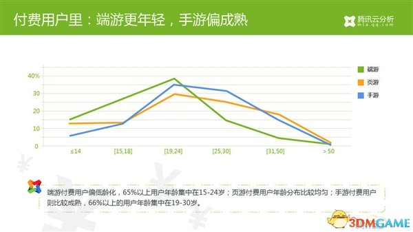- 端游付费用户偏低龄化,65%以上用户年龄集中在15-24岁;页游付费用户年龄分布比较均匀;手游付费用户则比较成熟,66%以上的用户年龄集中于19-30岁。