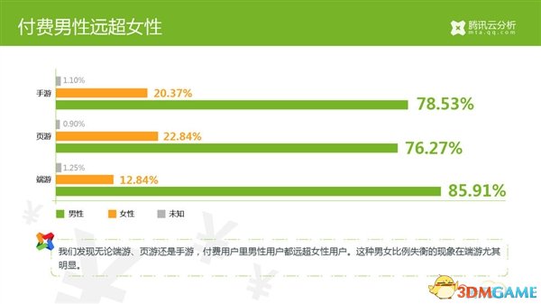 - 无论端游、页游还是手游,付费用户里男性用户都远超女性用户,而这种男女比例失衡的现象在端游尤其明显。