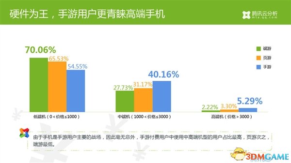 - 手机是手游用户主要的战场,因此毫无意外,手游付费用户中使用中高端机型的用户占比最高,页游次之,端游最低。