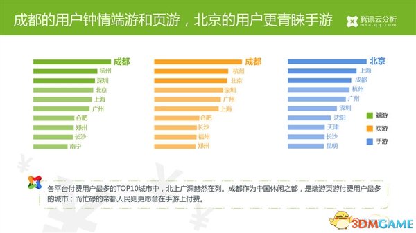 - 各平台付费用户最多的TOP10城市中,北上广深赫然在列。成都作为中国休闲之都,是端游页游付费用户最多的城市;而忙碌的帝都人民则更愿意在手游上付费。