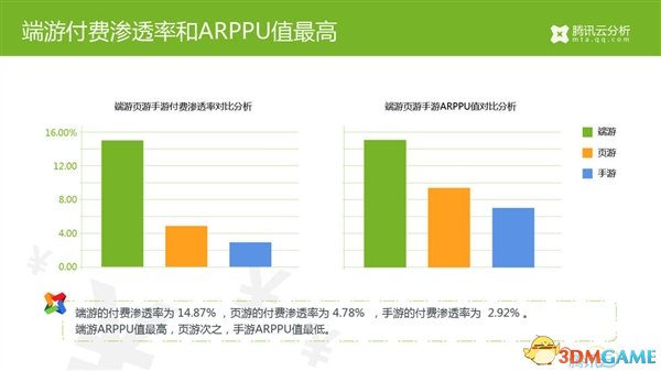 - 端游的付费渗透率为14.87%,页游的付费渗透率为4.78%,手游的付费渗透率为2.92%。端游ARPPU值最高,页游次之,手游ARPPU值最低。