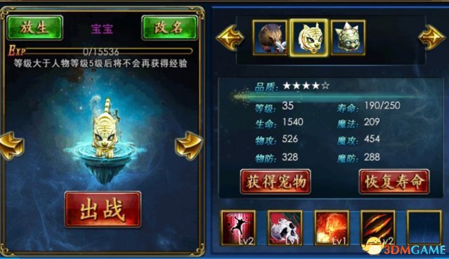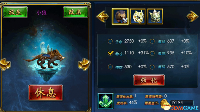 宠物做为玩家的小伙伴,可提供生命、魔法、物攻、魔攻、物防和魔防多个层面的加成。玩家可以选择自己急需的属性对宠物进行强化,强化成功可以提升强化目标属性的百分比加成,而面对后期的宠物,力求属性全能将让你立于不败之地哦。