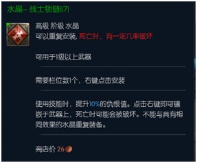 武器水晶(红色)推荐用“战士锁链”,大幅度提升技能仇恨,也可以使用“破坏者的威严”提升攻击力。