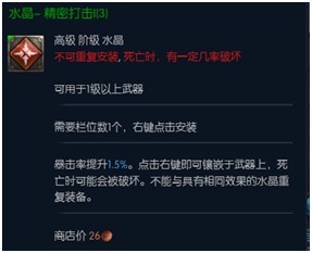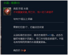 副本输出用水晶,和BAM用水晶比较类似。不过,副本中DPS更容易在怪物背后输出,因此提升背后暴击伤害的水晶实用性大大增加。武器水晶(红色)推荐使用“偷袭”+“精密打击”+“必杀一击”+“疾风冲刺”。