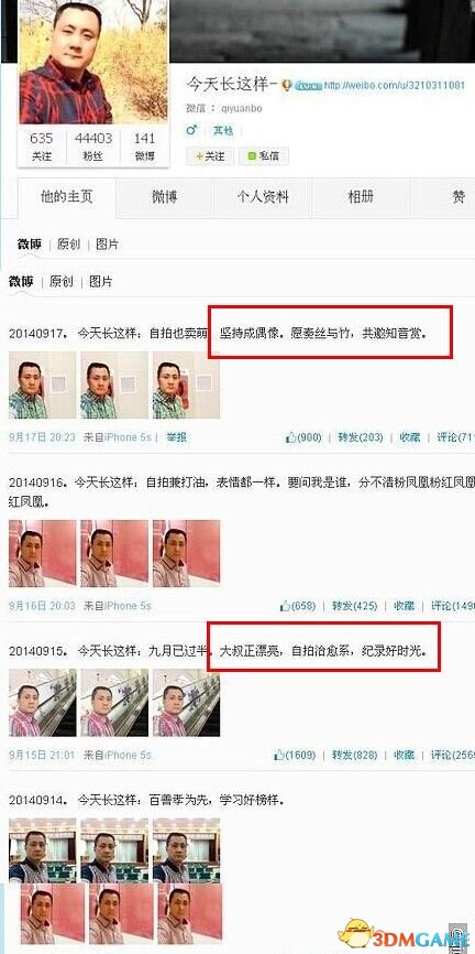 这个博主也是自恋到极致,每天三张自拍照,“今天长这样”,已经拍了5个多月了。。。。