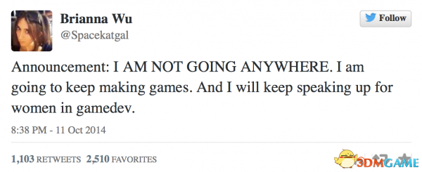 Wu最后在推特上表示,她不会被困难所吓倒,并且依然将为游戏行业中的女性从业者权利奋斗。“声明:我哪都不会去,我会继续做游戏,我会继续为游戏开发行业的女性代言。”