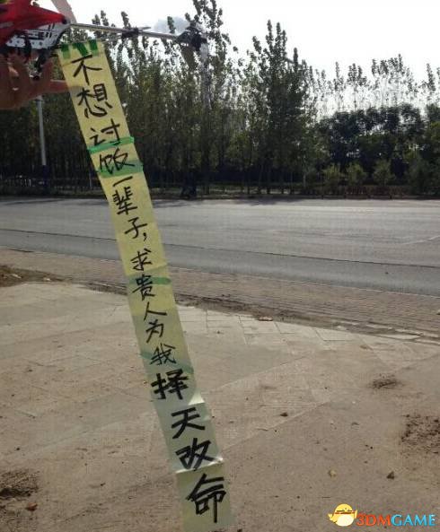 乞丐开飞机挂横幅 求贵人“择天改命”