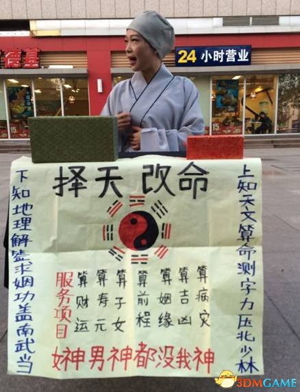 旁边是尼姑算命的摊子,前面一个牌子,牌子上面写道“择天改命。上知天文算命测字力压北少林,下知地理解签求姻功盖南武当。服务项目:算财运、算寿元、算子女、算前程、算姻缘、算吉凶、算病灾。男神女神都没有我神。”