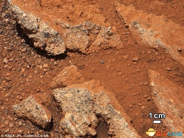 这张照片是好奇号火星车于2012年9月拍摄的,图中的外露岩石被红褐色灰尘覆盖,这与地球水沉积层结构相一致