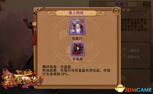 《笑傲江湖3D手游》中的侠客除了基础属性之外,侠客之间存在的羁绊还能额外提升侠客们的战斗力。比如任我行和任盈盈这样的父女档,就能增加任我行的生命值。尤其是当你的手上缺少属性比较好的高级侠客的时候,让手里的侠客进行更好的搭配将会获得更大的收益。另外,不同的门派也有更适合的侠客,比如封不平跟华山有加成 向问天跟日月有加成 不戒和尚和少林有加成。玩家可以选择更适合自己门派的侠客进行搭配。