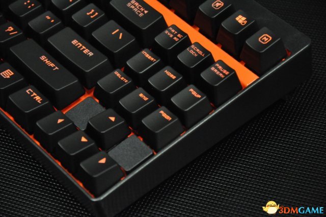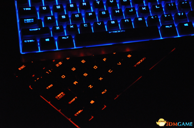V500S内衬一块315克钢板,这块钢板保证了玩家在操作时的稳定性以及机械轴的牢固程度。而且在F键区与主键区之间有一段突起的钢板装饰条,橙色烤漆与黑色磨砂外壳相得益彰,使键盘整体更为时尚酷炫。