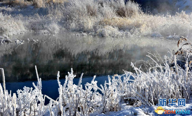 据新华网报道,近日,位于甘肃河西走廊西端的肃北蒙古族自治县出现雾凇景观,当地还极少出现这样的景致。