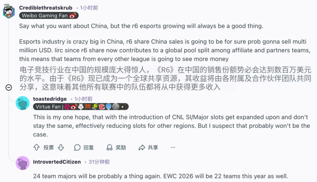 还是那篇Reddit,有人很快地算了一笔账,认为《彩虹六号:攻势》在中国市场的规模会达到数百万美元的水平,中国电竞市场的庞大体量是显而易见的,CN赛区的加入意味着整个联盟生态都将受益于这片市场的流量与商业增量。更重要的是,R6 SHARE的全球共享分红机制,意味着CN市场带来的收益将惠及所有联盟成员。