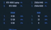 V社发布了2025年1月Steam硬件调查,最流行的配置如下: 显卡 RTX 3060依旧是最流行的显卡,占比5.2%,但份额比上个月(2024年12月)的6.02%下降了0.82个百分点。其次是RTX 4060笔记本和RTX 4060桌面版,但和3060一样也双双下滑了0.43和0.26个百分点。分辨率 1080P依旧是主流分辨率,占比56.03%,2K分辨率20.06%,增长了0.5%,4K更少,只有4%显存 8GB,占比36%12GB,占比19%6GB,占比12%内存 16GB,占比45%32GB,占比33%8GB,占比10%CPU核心 6核心,占比31%8核心,占比22%4核心,占比17%操作系统 Windows 11,53%Windows 10,43%Linux,2%而在语言方面,英文用户重新回到第一