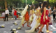 昨日艳阳高照,微风徐徐。小寨十字的环形天桥上,7名身材高挑、穿着清凉的女子人手拉着一棵大白菜,出现在西安小寨天桥上,引来行人侧目。这7名美女有的穿着轻纱质地的演出服,有的用绿萝藤条做装饰搭在肩上,也有的直接用大白菜帮子粘接成一条裙子穿在身上……而更特别的是,她们都用绳牵着一棵白菜。“她们这是干什么呢?”围观者纷纷嘀咕。一名美女说,她们是在搞行为艺术,以此表达她们的压力和寂寞。另一女孩补充说:“现代人的生活节奏快,精神压力大,没朋友可以倾诉,即便有朋友倾诉,也不见得能帮你清除寂寞,大白菜也寂寞,又有随时被丢弃的危险,看似遛白菜,其实是在遛自己。”一旁围观的一名女士听到这样的答案后,很不屑地说:“现在的社会,谁没有压力,有压力才