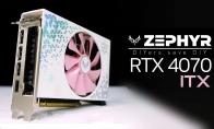 西风(Zephyr),一个名不见经传的显卡品牌,却干了一件大事,他们的新款RTX 4070樱吹雪,是全球第一款采用ITX迷你设计的RTX 4070。它只配备了单个风扇,双插槽身材,三围尺寸只有172x123×42毫米——这让那些动辄三风扇的设计情何以堪。对于散热能力,官方声称25℃室温下,风扇转速只有2400RPM,但核心、显存最高温度分别可以控制在73℃、68℃,降低了8℃、10℃。但是官方没说对比的是谁,可能是自家的双风扇标准版RTX 4070。内部的PCB电路板自然也是定制的,号称专案研发,单个8针供电。虽然没有预超频,但性能释放正常,3DMark Speed Way跑分4442,和该卡的平均值4450基本相同。西风称该卡的第一批已经售罄,第二批将在7月中到货。
