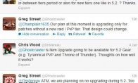 《魔兽世界》开发团队的首席设计师螃蟹今日在推特上表示5.2的新装备将不能进行强化升级。螃蟹的推文螃蟹的回复了两条玩家提问,谈及了5.2补丁中的装备升级系统:Q:勇气点数升级系统是只能应用于过渡版本还是也能应用于像5.2这样的新版本?A:我们现在的计划是,升级系统只会应用于没有新的团队副本/PVP赛季的版本。这个设计可能会改变。Q:装备升级将继续可用在5.2版本的装备上吗?(比如暴虐角斗士和雷神王座的装备)你对它(装备升级系统)的运行情况有何评价?A:我们眼下没有计划对5.2的装备进行升级。对它的运行情况作出评价为时尚早。我肯定它还需要调整。5.1补丁里新开放的装备升级系统中,玩家可以花费勇气和正义点数将自己身上的装备进行多次升级,获得更好的属性。不过这个系统将不会支持5.2补丁中的新装备。看来暴雪对于装备升级系