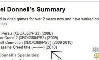 网络传现任Ubisoft 3D 动画师简介泄密事件,令大量玩家为之观注,而当事人Michael Donnell 也急忙将简介做出修改,试图将此事件消息给压至最低点。这起事件原于玩家上网观看游戏的开发团队资料,无意间查询到这位名为Michael Donnell 的3D 动画师简介网页,发现其经历简介竟然有《刺客信条》的新系列作品之条目列在其中,引发了网友争相去观看这位3D 动画师到底还有什么秘密可挖。该3D 动画师的简介写着,在2008 年时曾参与《波斯王子:时之沙》;2009 参与《刺客信条2》;2009 至2010 年参与了《细胞分裂:断罪》的开发,在末项写着New Assassins Creed title 2010。或许玩家会猜测这可能是他在2010 还有参与了《刺客信条2》动画设计,但上头明显写着New
