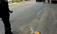 记者在距爆炸点100米的桥下,看到一滩黑色疑似危化品残留物。一消防人员往此物上倒水,该物体冒出气泡,并发出“呲呲”声。随后燃起火苗,火星四溅,发出较大的爆炸声。图片来自微博。