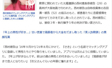 有时候,看到日本媒体又用“X千年一遇的美少女”这种标题,你还真的没法指责,因为在人家那里,“美少女”俨然成了一种新兴的“脱罪方式”。就在前段时间,日本大阪检察厅宣布了一件“3亿日元特大诈骗案”的判决书。不过,让所有人没想到的是,即使法院已经宣布了判决书,同时犯罪嫌疑人本人都无异议的情况下,那几十位受害者其中的一部分人却急了。他们联名上书表示自己被骗钱纯属心甘情愿,希望法院能够免除她的责罚,哪怕减轻一些罪过,让她不用坐牢也好。不仅如此,其中还有不少人表示,即使法院不愿意从轻发落,那他也会在监狱外默默等待,希望有机会能够再续前缘。而这一切狗血的缘由只是因为,犯人西村惠梨奈长得太好看了。他们实在不舍得让她受到惩罚。毕竟,一个年轻貌美会照顾人,并且自称“只喜欢年纪大的老男人,看到年纪小的就咳嗽”的女人,主动出现在自己眼